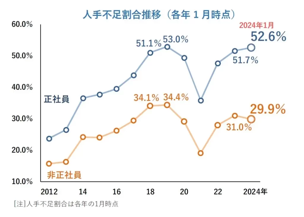 参考:帝国データバンク❘正社員の人手不足は52.6% 「2024年問題」の建設・物流・医療業では約7割